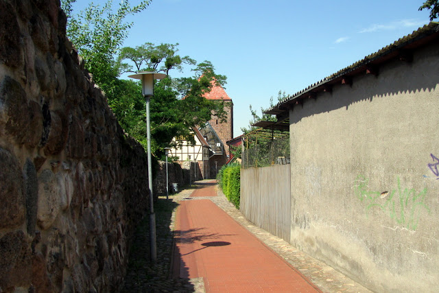 W Pasewalku pokręciłem się trochę wkoło centrum. Mają tam bardzo fajną drogę rowerową wzdłuż dawnych murów miejskich. Jadąc tą drogą zobaczyłem jak się tam niektórym kapitalnie mieszka - to jest praktycznie centrum miasta, widać wieżę kościoła na głównym rynku, a tu domki z ogrodami i cisza.